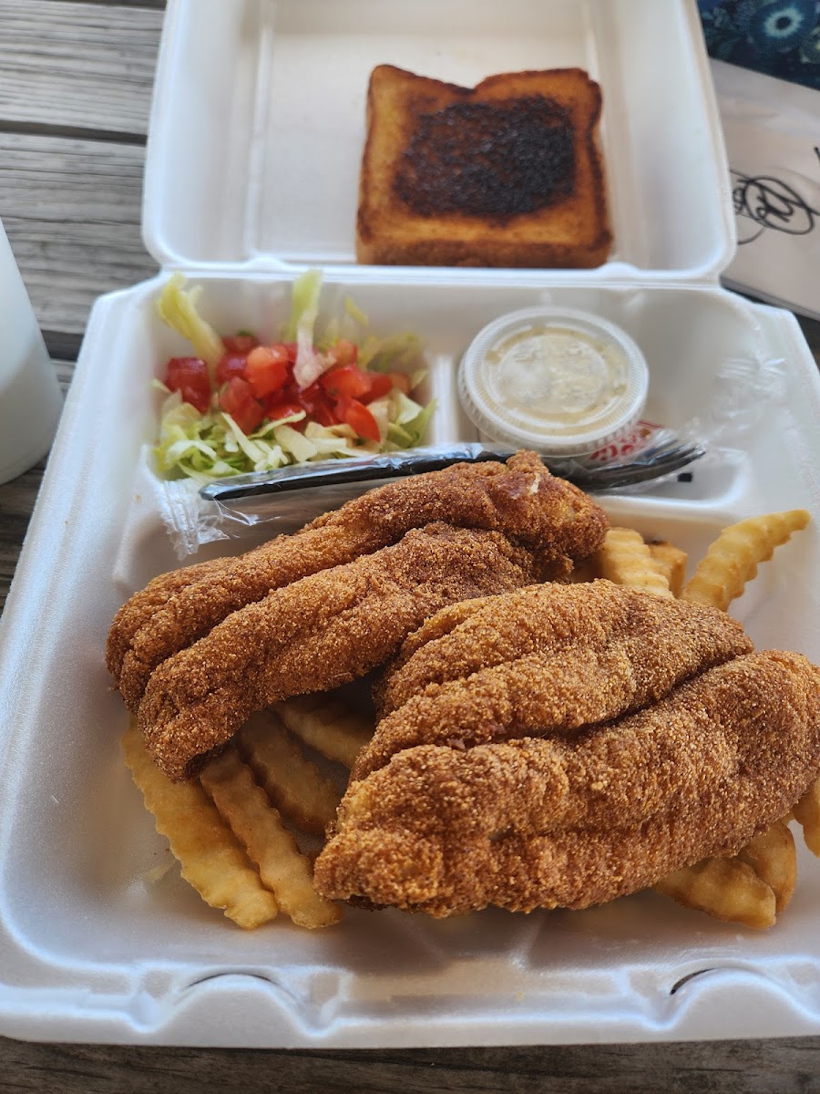 I had passed through Taft a couple of times but never saw this place when it was open; I thought it had been abandoned. However, when it was open, it was busy, and I was convinced there must be a good reason for that. So, I decided to order lunch—specifically, the Red Fish Filet sandwich and batter-fried veggies. I chose the mushrooms as my side. The ranch dressing that accompanied the veggie dish was excellent. The sandwich came in a large bun and was absolutely delicious! The fried mushrooms were of plenty. The customer service was friendly, and I could tell right away that it was a family-run business because there was an "In Memory Of" poster for a beloved young man displayed in the side window.